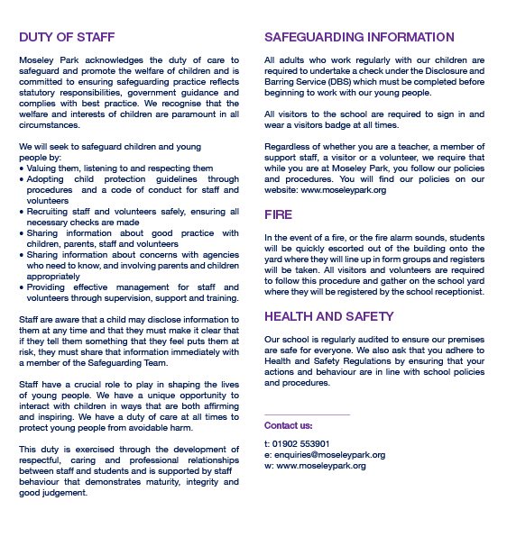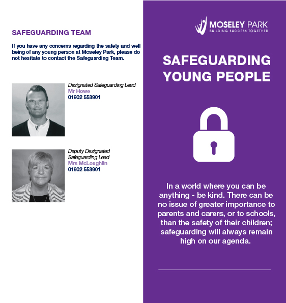 The welfare of each and every student at Moseley Park is of paramount importance and we aim to provide a caring, supportive and positive environment where children can feel safe, are able to learn and develop themselves. Adults in our school take all welfare concerns seriously and encourage children and young people to talk to us about anything that may worry them.