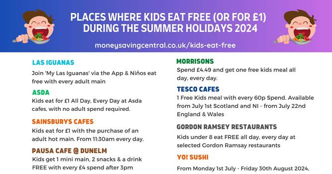 The long summer break can be a strain on family budgets – but help and support is available. A wide range of cafes and restaurants are offering discounts or free food for children during the...
