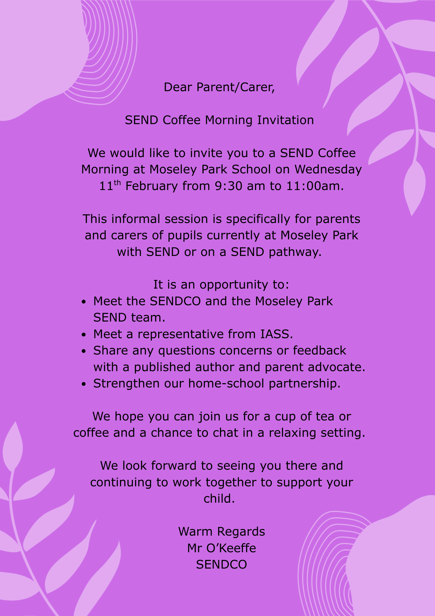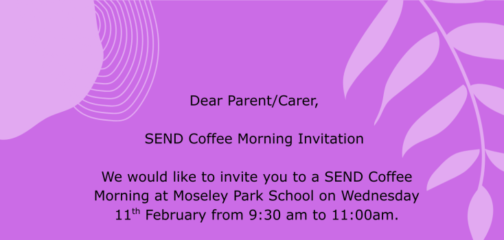 We would like to invite you to a SEND Coffee Morning at Moseley Park School on Wednesday 11th February 2026 from 9:30am to 11am. This informal session is specifically for parents and carers of pupils...